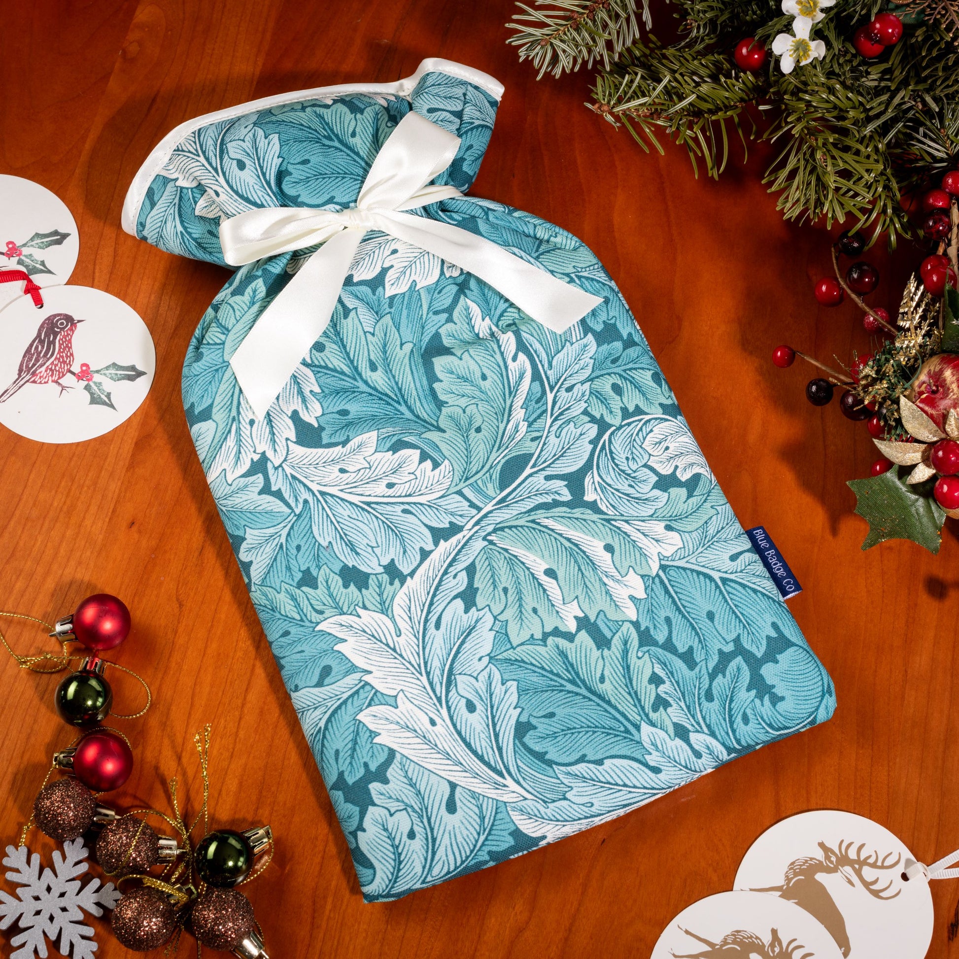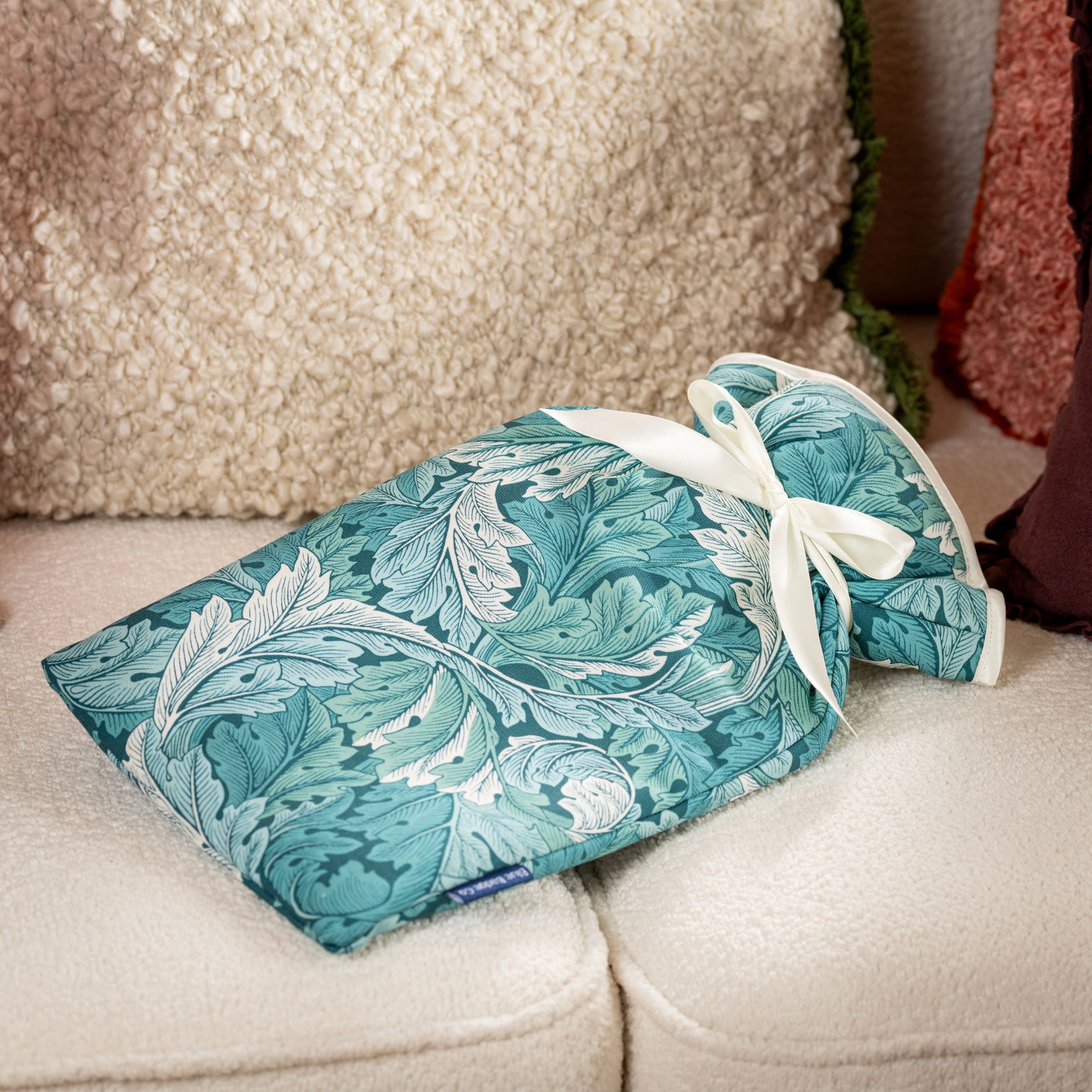 Relax in warmth and comfort with this luxurious large hot water bottle in stunning William Morris Acanthus Teal design. The 1.5-litre rubber bottle is beautifully wrapped in a soft, generously padded cotton cover with satin ribbon finish. Perfect for soothing aches and pains or keeping cosy on chilly nights. Handmade in the UK.