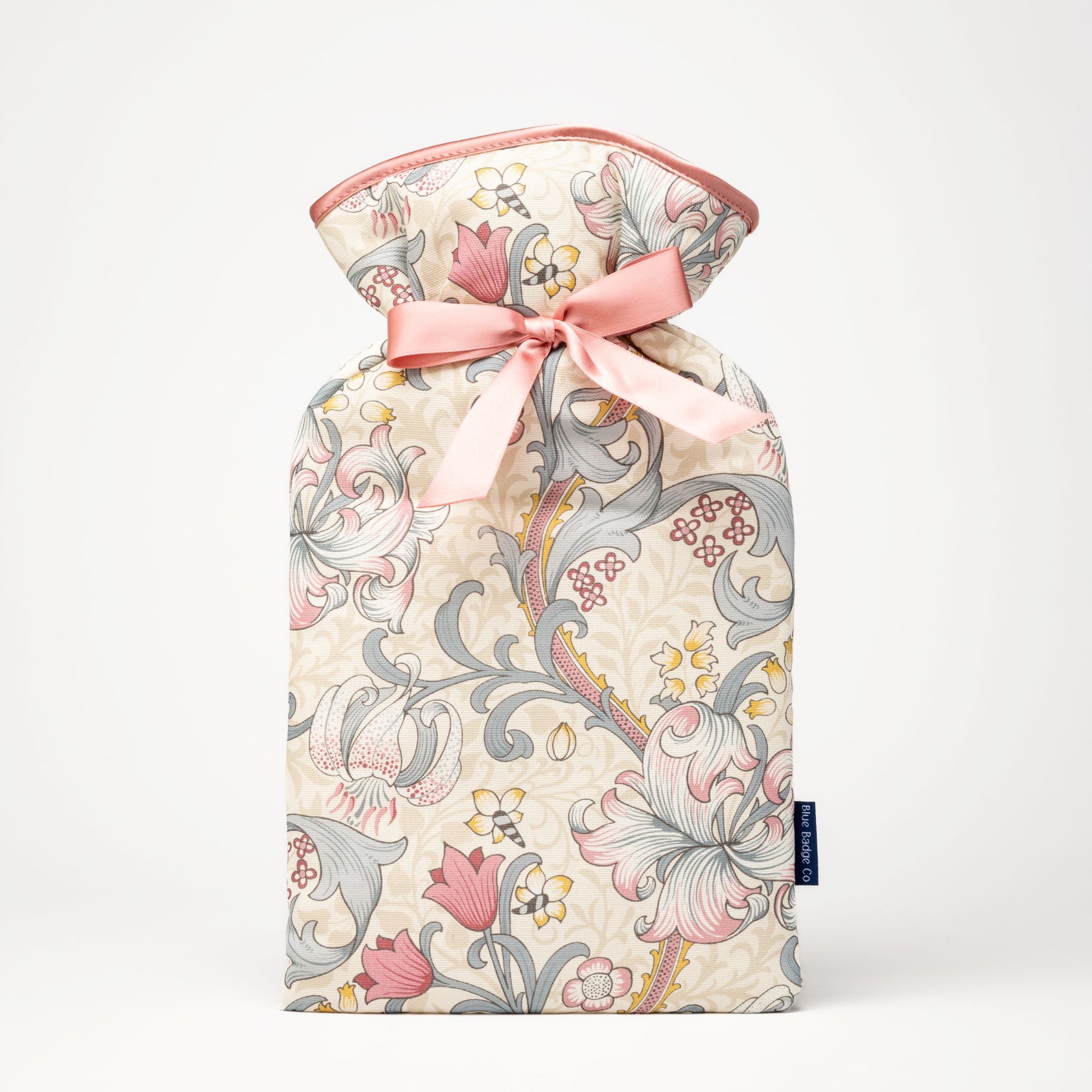 Relax in warmth and comfort with this luxurious large hot water bottle in exquisite William Morris Golden Lily Plum design. The 1.5-litre rubber bottle is beautifully wrapped in a soft, generously padded cotton cover with satin ribbon finish. Perfect for soothing aches and pains or keeping cosy on chilly nights. Handmade in the UK.