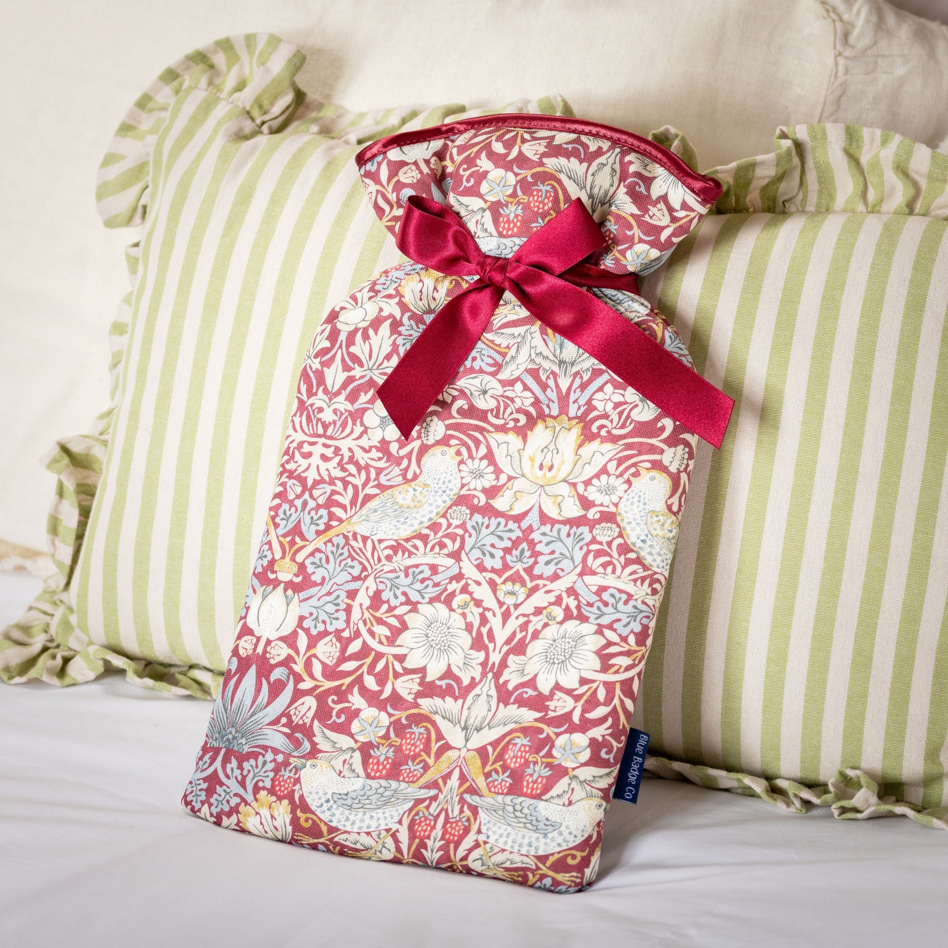 Relax in warmth and comfort with this luxurious large hot water bottle in iconic William Morris Strawberry Thief Plum design. The 1.5-litre rubber bottle is beautifully wrapped in a soft, generously padded cotton cover with satin ribbon finish. Perfect for soothing aches and pains or keeping cosy on chilly nights. Handmade in the UK.