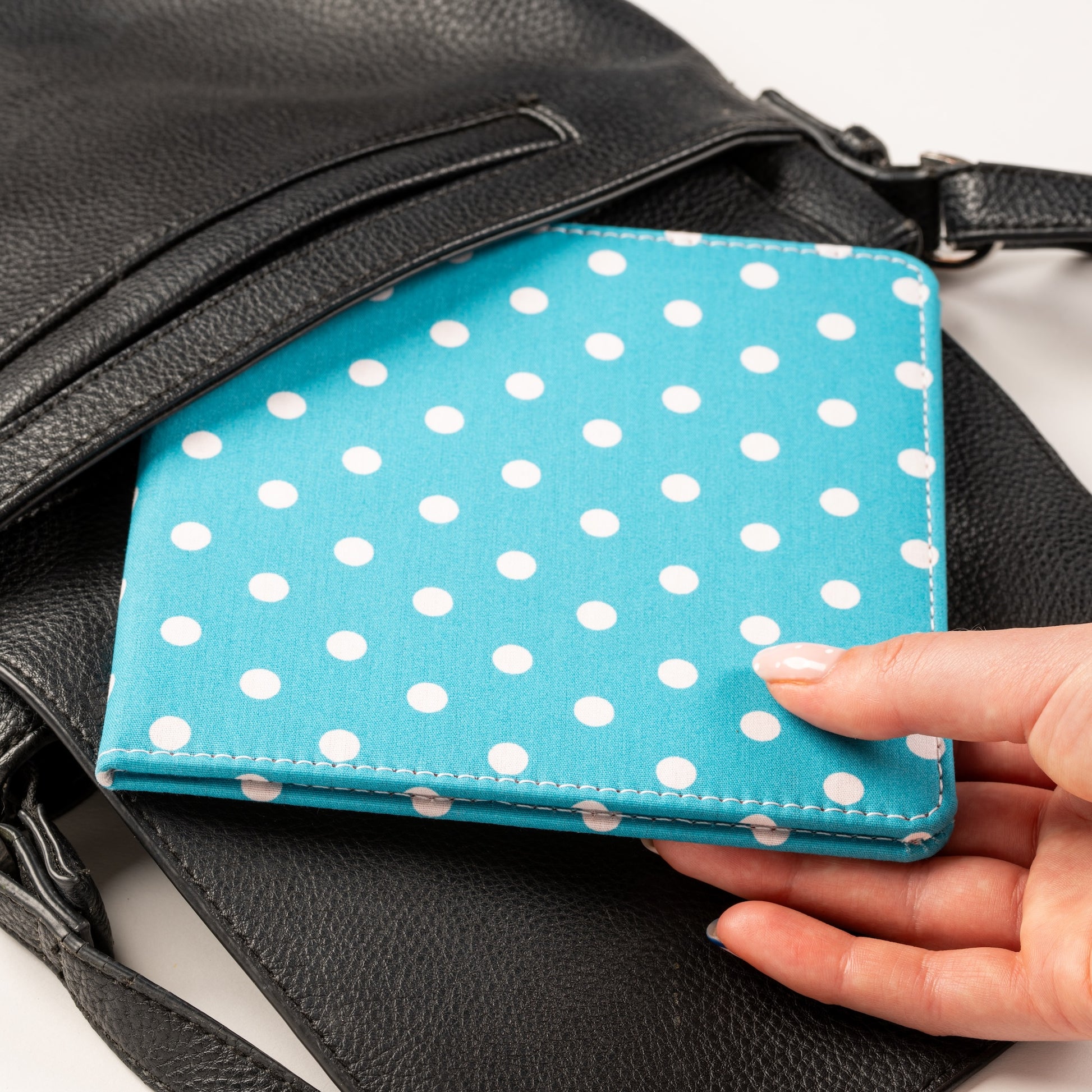 Keep your Blue Badge disabled parking permit safe, compliant, and organised with this refreshing aquamarine spotty-patterned wallet. Hand-sewn from premium cotton in calming sea-inspired tones, this UK-made wallet features our exclusive Hologram Safe© design - a playful spotted pattern that brings tranquillity and charm every time you use it.