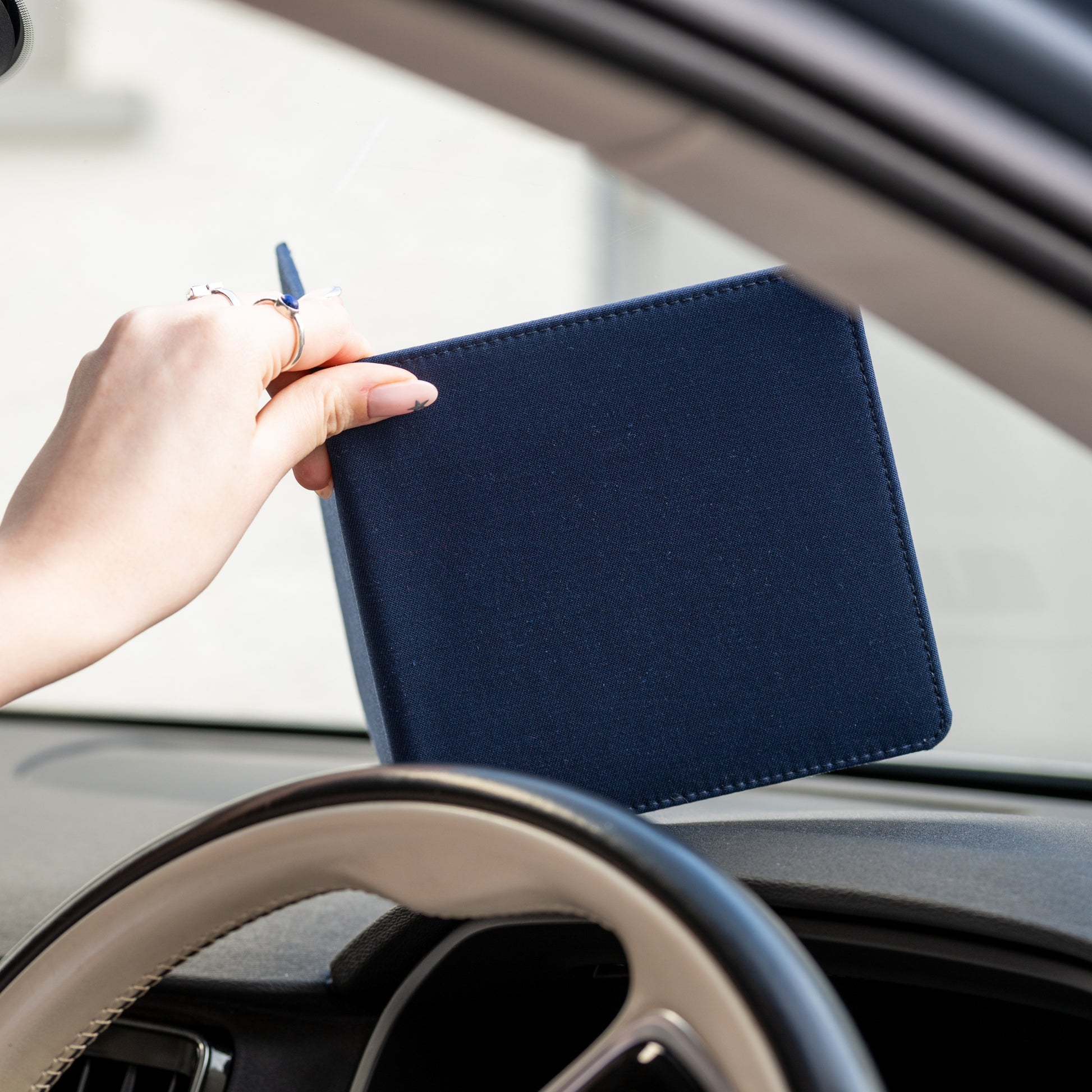 Keep your Blue Badge disabled parking permit safe, compliant, and organised with this classic navy drill-patterned wallet. Hand-sewn from premium cotton in smart navy tones with traditional drill weave texture, this UK-made wallet features our exclusive Hologram Safe© design - a timeless pattern that offers understated elegance and professional style that brings confidence every time you use it.