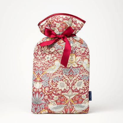 Relax in warmth and comfort with this luxurious large hot water bottle in iconic William Morris Strawberry Thief Plum design. The 1.5-litre rubber bottle is beautifully wrapped in a soft, generously padded cotton cover with satin ribbon finish. Perfect for soothing aches and pains or keeping cosy on chilly nights. Handmade in the UK.